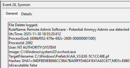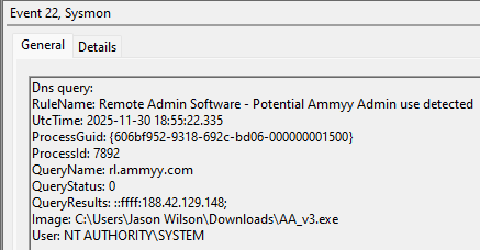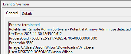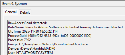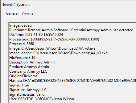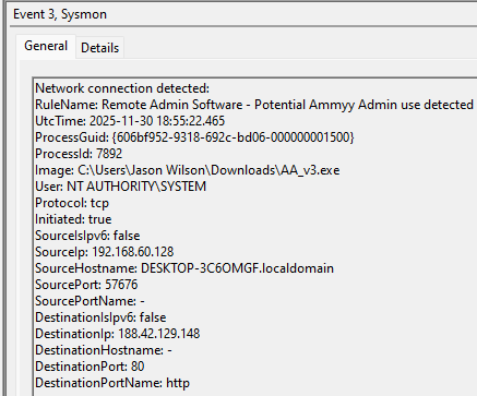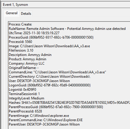 An example test of the configuration results can be found here with the Ammyy Admin installer. These are the exported Sysmon logs from my test in a VM but I will highlight below this section some screenshot examples of this testing: