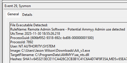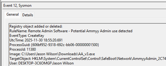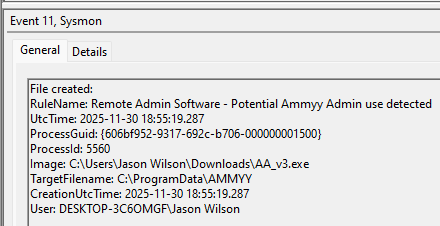 These are only a dozen or so of the example logged events out of the 350~ or so that are logged during the installation and initial execution process. While that is allot of events it provides a wide surface area of visibility for hunting in a SIEM and for rule creation to hunt for RMM’s within your network even if the files have been renamed, repacked/obfuscated, etc.
