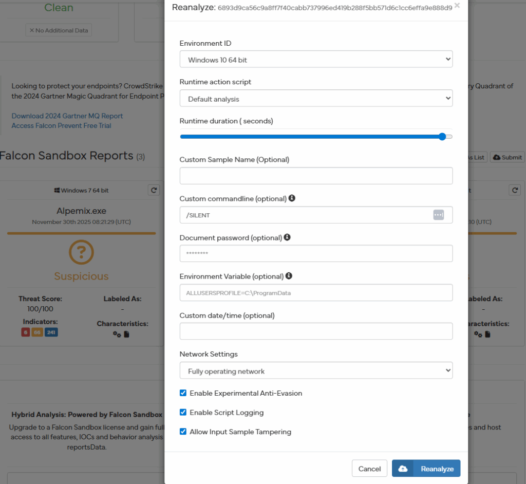 Once I got the installer I would go to Hybrid-Analysis and sandbox the installer with flags for silent/quiet install based on the type of installer (Innosetup uses “/SILENT”, Installshield uses “/s”, NSIS uses “/S” and the Windows + Wix installers use “/qn”.
