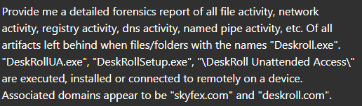 The website https://www.shouldiremoveit.com/index.aspx was also very useful to pivot on potentially additional files that the software writes to disk that may not have been seen during sandbox sessions.